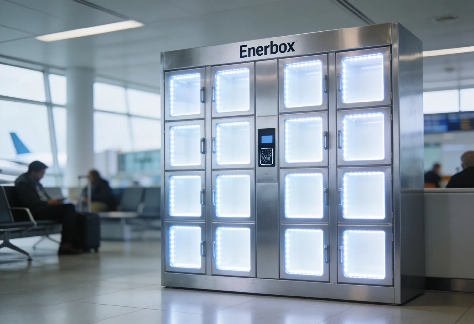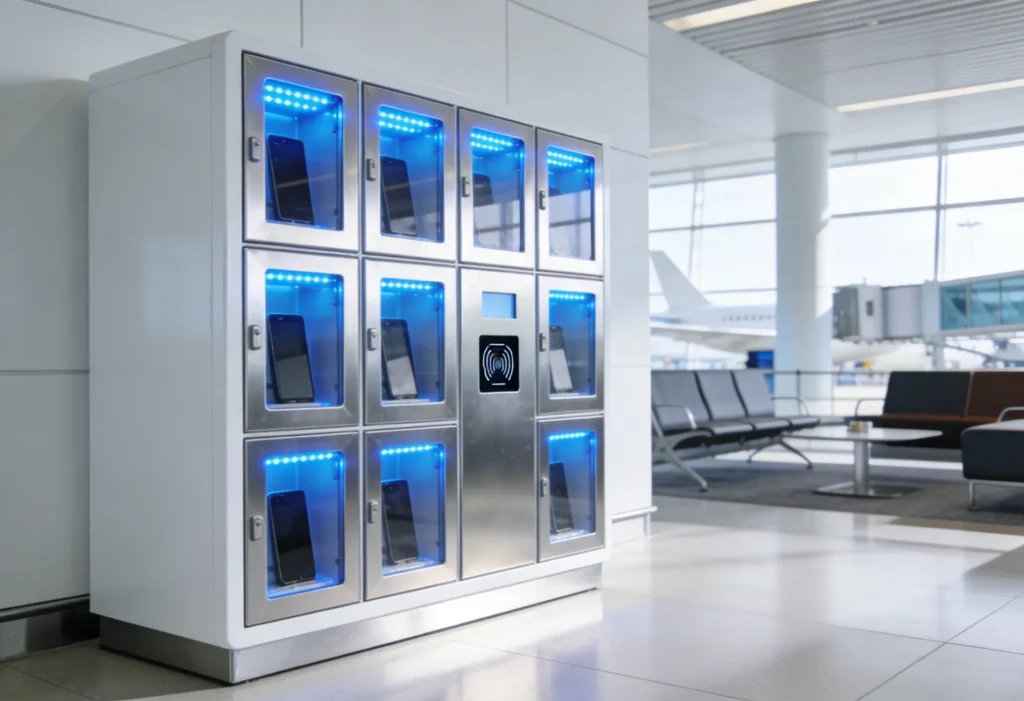 Lockers de carga rápida con desinfección mediante foco vc y seguridad por huella biométrica. La solución de carga segura para espacios de alta afluencia.